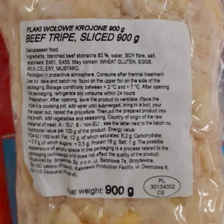 flaki wołowe, woda, błonnik sojowy, sól, e451, e450