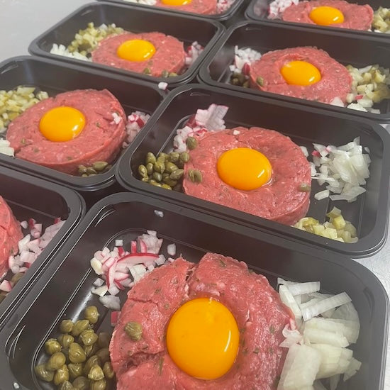 Vi legger til de beste tilbehør: finhakket løk, sur agurk eller kapers, finhakket reddik, finhakket sylta rødbeter og selvfølgelig en rå eggeplomme.